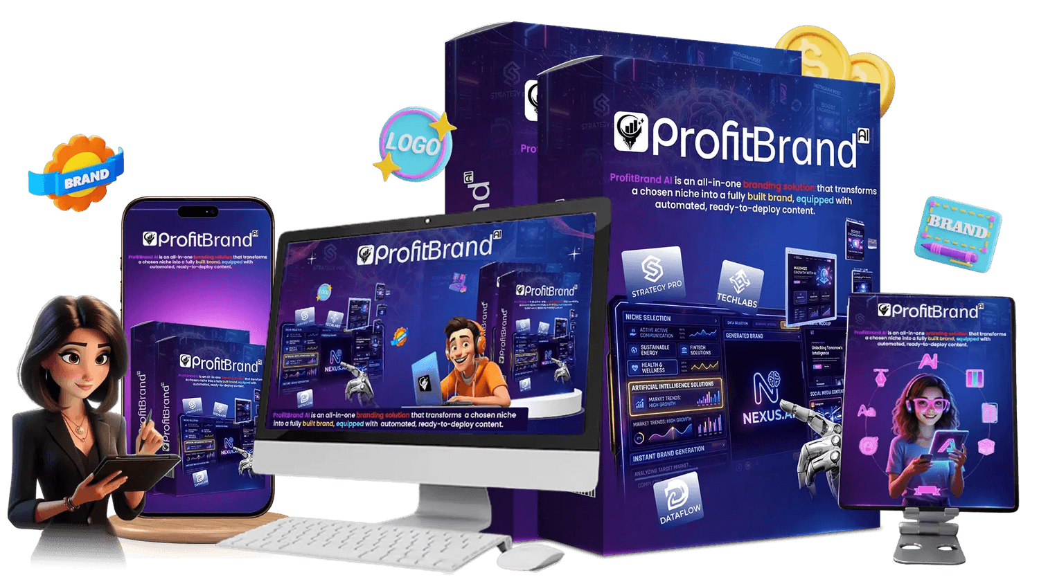 ProfitBrand AI is a cloud-based, multi-functional AI platform designed to automate the most critical aspects of digital branding. It isn't just a simple graphic tool; it’s an integrated ecosystem that uses advanced machine learning to generate professional brand assets.